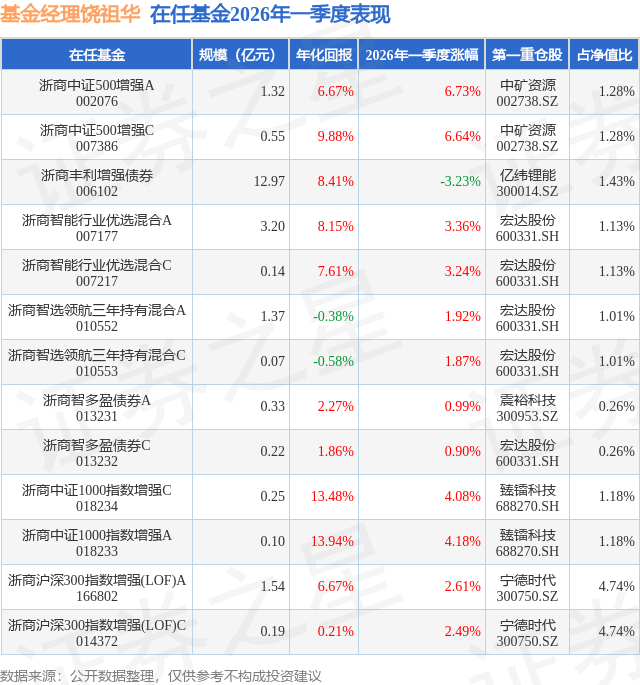浙商智选领航三年持有混合C现任基金经理为饶祖华,本季度增聘基金经理饶祖华,近期离任的基金经理为刘新正。其中在任基金经理饶祖华已从业0年又236天,2025年9月3日正式接手管理浙商智选领航三年持有混合C,任职期间累计回报为1.95%。目前还管理着13只基金产品(包括A类和C类),其中本季度表现最佳的基金为浙商中证500增强A(002076),季度净值涨幅为6.73%。