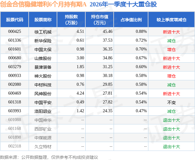 从基金规模来看,创金合信稳健增利6个月持有期A基金2026年一季度公布的基金规模为0.33亿元,较上一期规模3889.16万元变化了-634.19万元,环比变化了-16.31%。该基金最新一期资产配置为:股票占净值比14.7%,债券占净值比62.2%,现金占净值比23.09%。从基金持仓来看,该基金当季前十大股票仓位达6.28%,第一大重仓股为徐工机械(000425),持仓占比为0.88%。