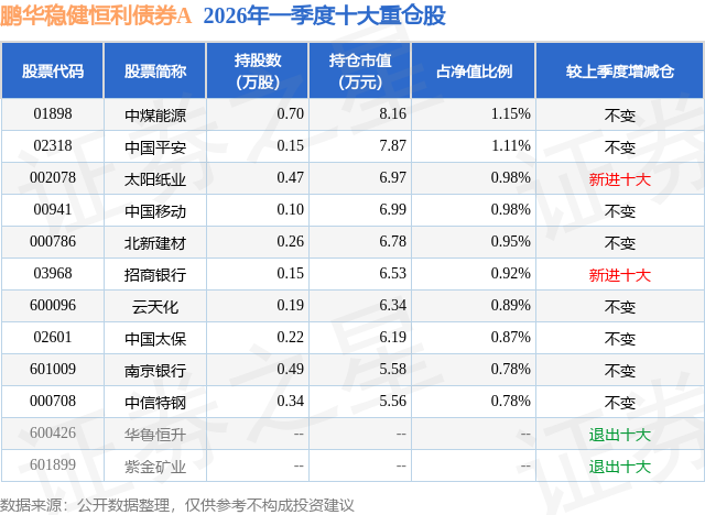 从基金规模来看,鹏华稳健恒利债券A基金2026年一季度公布的基金规模为0.02亿元,较上一期规模514.72万元变化了-352.23万元,环比变化了-68.43%。该基金最新一期资产配置为:股票占净值比16.85%,债券占净值比82.32%,现金占净值比17.44%。从基金持仓来看,该基金当季前十大股票仓位达9.41%,第一大重仓股为中煤能源(01898),持仓占比为1.15%。