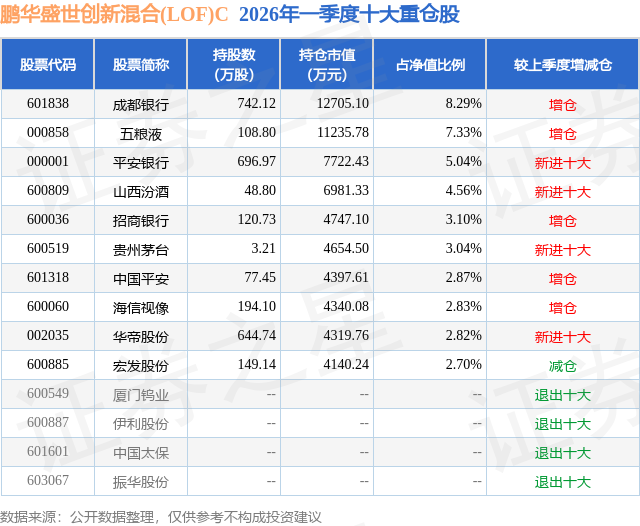 从基金规模来看,鹏华盛世创新混合(LOF)C基金2026年一季度公布的基金规模为4.72亿元,较上一期规模2.6亿元变化了2.13亿元,环比变化了81.98%。该基金最新一期资产配置为:股票占净值比82.0%,无债券类资产,现金占净值比18.43%。从基金持仓来看,该基金当季前十大股票仓位达42.58%,第一大重仓股为成都银行(601838),持仓占比为8.29%。