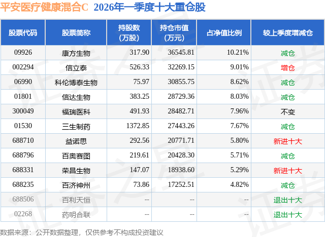 从基金规模来看,平安医疗健康混合C基金2026年一季度公布的基金规模为18.77亿元,较上一期规模4.97亿元变化了13.8亿元,环比变化了277.76%。该基金最新一期资产配置为:股票占净值比94.41%,债券占净值比2.38%,现金占净值比6.26%。从基金持仓来看,该基金当季前十大股票仓位达73.12%,第一大重仓股为康方生物(09926),持仓占比为10.21%。