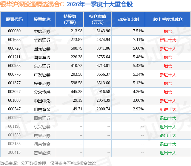 从基金规模来看,银华沪深股通精选混合C基金2026年一季度公布的基金规模为5.09亿元,较上一期规模67.15万元变化了5.08亿元,环比变化了75631.42%。该基金最新一期资产配置为:股票占净值比88.69%,无债券类资产,现金占净值比15.76%。从基金持仓来看,该基金当季前十大股票仓位达51.77%,第一大重仓股为中信证券(600030),持仓占比为7.51%。