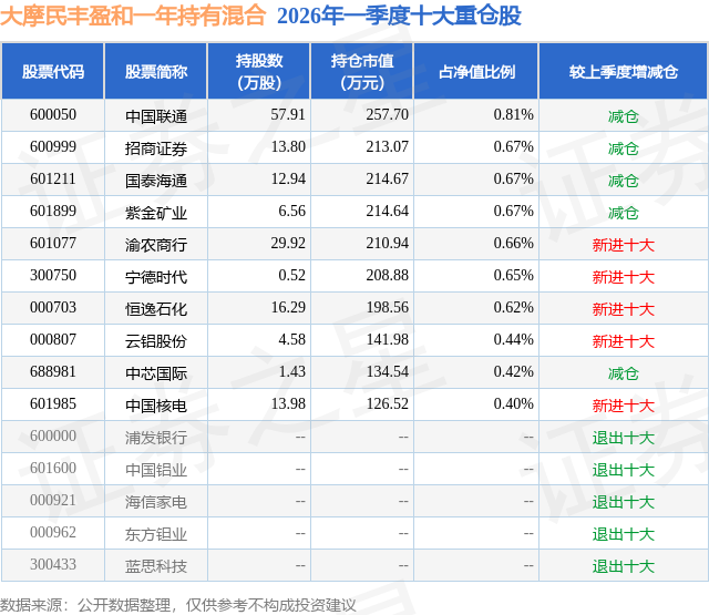 从基金规模来看,大摩民丰盈和一年持有混合基金2026年一季度公布的基金规模为3.2亿元,较上一期规模4.8亿元变化了-1.61亿元,环比变化了-33.46%。该基金最新一期资产配置为:股票占净值比15.77%,债券占净值比104.27%,现金占净值比4.09%。从基金持仓来看,该基金当季前十大股票仓位达6.01%,第一大重仓股为中国联通(600050),持仓占比为0.81%。