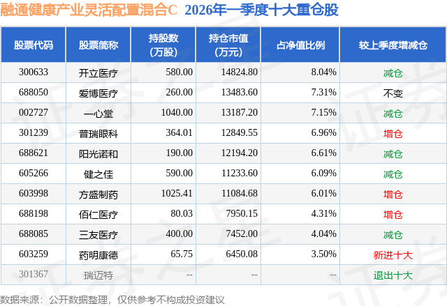 从基金规模来看,融通健康产业灵活配置混合C基金2026年一季度公布的基金规模为4.38亿元,较上一期规模5.44亿元变化了-1.06亿元,环比变化了-19.56%。该基金最新一期资产配置为:股票占净值比93.98%,无债券类资产,现金占净值比6.26%。从基金持仓来看,该基金当季前十大股票仓位达60.02%,第一大重仓股为开立医疗(300633),持仓占比为8.04%。
