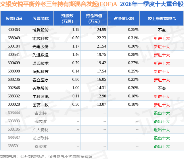 从基金规模来看,交银安悦平衡养老三年持有期混合发起(FOF)A基金2026年一季度公布的基金规模为0.68亿元,较上一期规模5769.33万元变化了1020.23万元,环比变化了17.68%。该基金最新一期资产配置为:股票占净值比5.69%,债券占净值比5.13%,现金占净值比2.07%。从基金持仓来看,该基金当季前十大股票仓位达2.55%,第一大重仓股为博腾股份(300363),持仓占比为0.35%。