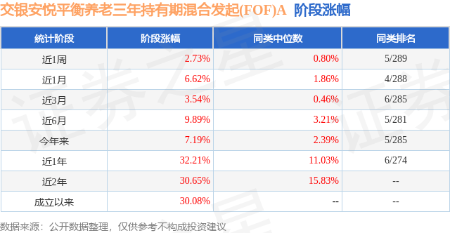 从业绩表现来看,交银安悦平衡养老三年持有期混合发起(FOF)A基金过去一年净值涨幅为32.21%,在同类基金中排名6/274,同类基金过去一年净值涨幅中位数为11.03%。而基金过去一年的最大回撤为-8.54%,成立以来的最大回撤为-10.86%。