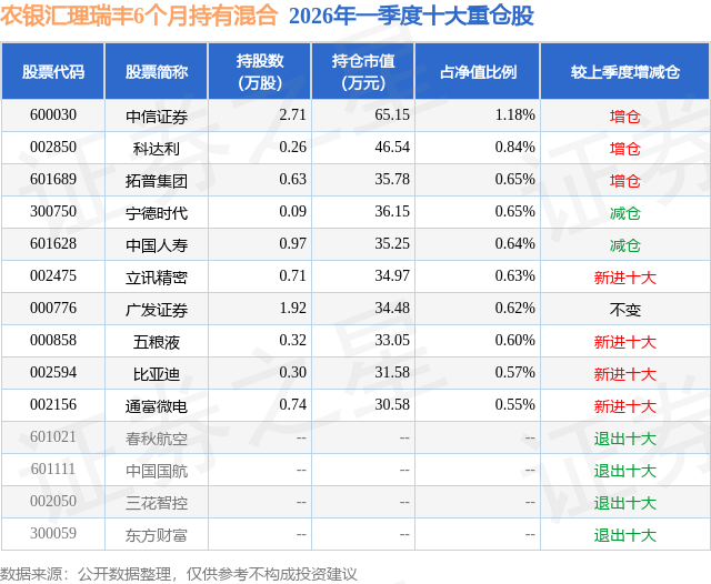 证券之星消息,日前农银汇理瑞丰6个月持有混合基金公布一季报,2026年一季度最新规模0.55亿元,季度净值涨幅为-2.11%。