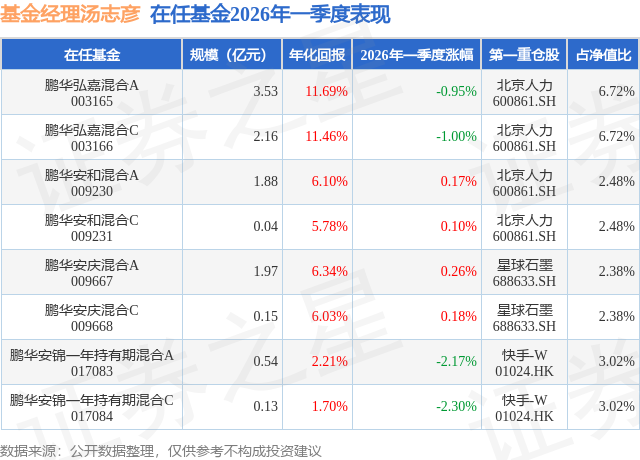 从基金规模来看,鹏华安庆混合A基金2026年一季度公布的基金规模为1.97亿元,较上一期规模1.9亿元变化了701.81万元,环比变化了3.7%。该基金最新一期资产配置为:股票占净值比27.67%,债券占净值比19.17%,现金占净值比14.07%。从基金持仓来看,该基金当季前十大股票仓位达18.57%,第一大重仓股为星球石墨(688633),持仓占比为2.38%。