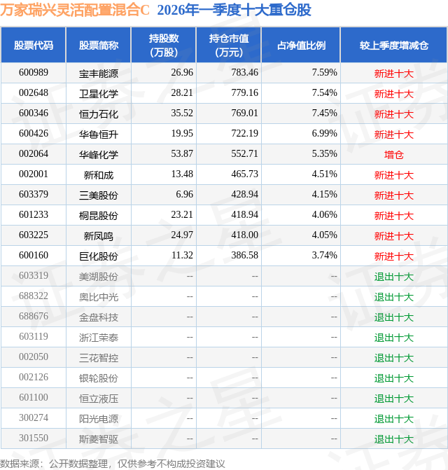 从基金规模来看,万家瑞兴灵活配置混合C基金2026年一季度公布的基金规模为0.2亿元,较上一期规模7.02万元变化了1955.97万元,环比变化了27860.88%。该基金最新一期资产配置为:股票占净值比84.72%,债券占净值比6.2%,现金占净值比7.89%。从基金持仓来看,该基金当季前十大股票仓位达55.43%,第一大重仓股为宝丰能源(600989),持仓占比为7.59%。