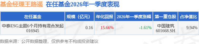 证券之星消息,日前中泰ESG主题6个月持有混合发起基金公布一季报,2026年一季度最新规模0.16亿元,季度净值涨幅为-1.61%。