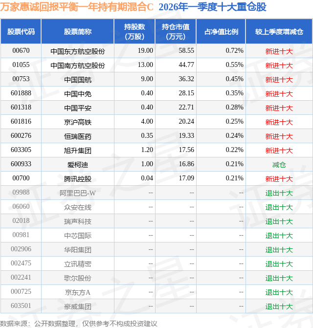 从基金规模来看,万家惠诚回报平衡一年持有期混合C基金2026年一季度公布的基金规模为0.42亿元,较上一期规模1.02亿元变化了-6046.41万元,环比变化了-59.12%。该基金最新一期资产配置为:股票占净值比4.46%,债券占净值比82.75%,现金占净值比2.46%。从基金持仓来看,该基金当季前十大股票仓位达3.48%,第一大重仓股为中国东方航空股份(00670),持仓占比为0.72%。