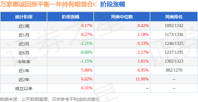 证券之星消息,日前万家惠诚回报平衡一年持有期混合C基金公布一季报,2026年一季度最新规模0.42亿元,季度净值涨幅为-1.82%。