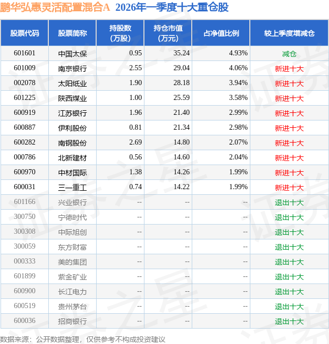 从基金规模来看,鹏华弘惠灵活配置混合A基金2026年一季度公布的基金规模为0.02亿元,较上一期规模193.5万元变化了-41.47万元,环比变化了-21.43%。该基金最新一期资产配置为:股票占净值比39.82%,无债券类资产,现金占净值比69.59%。从基金持仓来看,该基金当季前十大股票仓位达30.57%,第一大重仓股为中国太保(601601),持仓占比为4.93%。