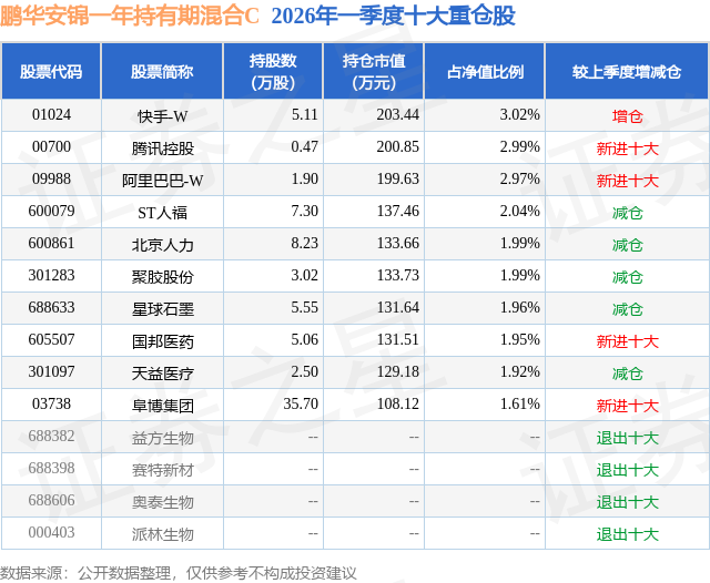从基金规模来看,鹏华安锦一年持有期混合C基金2026年一季度公布的基金规模为0.13亿元,较上一期规模8076.66万元变化了-6742.89万元,环比变化了-83.49%。该基金最新一期资产配置为:股票占净值比28.98%,无债券类资产,现金占净值比73.26%。从基金持仓来看,该基金当季前十大股票仓位达22.44%,第一大重仓股为快手-W(01024),持仓占比为3.02%。