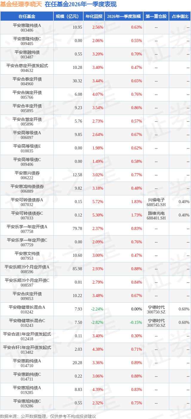 平安可转债债券C现任基金经理为李晓天 江正清,本季度增聘基金经理李晓天、江正清,近期离任的基金经理为陈浩宇。其中在任基金经理李晓天已从业1年又191天,2025年4月28日正式接手管理平安可转债债券C,任职期间累计回报为29.34%。目前还管理着29只基金产品(包括A类和C类),其中本季度表现最佳的基金为平安可转债债券A(007032),季度净值涨幅为1.83%。