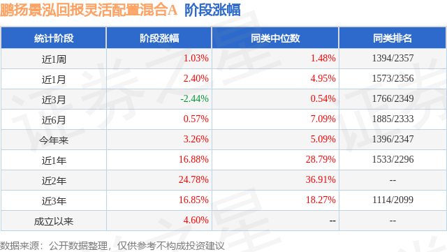 从业绩表现来看,鹏扬景泓回报灵活配置混合A基金过去一年净值涨幅为16.88%,在同类基金中排名1533/2296,同类基金过去一年净值涨幅中位数为28.79%。而基金过去一年的最大回撤为-9.87%,成立以来的最大回撤为-45.85%。