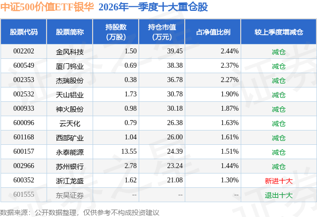 从基金规模来看,中证500价值ETF银华基金2026年一季度公布的基金规模为0.16亿元,较上一期规模2266.09万元变化了-648.01万元,环比变化了-28.6%。该基金最新一期资产配置为:股票占净值比97.98%,无债券类资产,现金占净值比2.03%。从基金持仓来看,该基金当季前十大股票仓位达18.34%,第一大重仓股为金风科技(002202),持仓占比为2.44%。