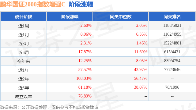 从业绩表现来看,鹏华国证2000指数增强C基金过去一年净值涨幅为57.57%,在同类基金中排名777/3646,同类基金过去一年净值涨幅中位数为42.97%。而基金过去一年的最大回撤为-13.18%,成立以来的最大回撤为-31.63%。