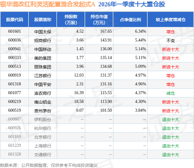 从基金规模来看,银华混改红利灵活配置混合发起式A基金2026年一季度公布的基金规模为0.26亿元,较上一期规模3335.5万元变化了-706.18万元,环比变化了-21.17%。该基金最新一期资产配置为:股票占净值比88.88%,债券占净值比5.72%,现金占净值比6.6%。从基金持仓来看,该基金当季前十大股票仓位达49.56%,第一大重仓股为中国太保(601601),持仓占比为6.34%。