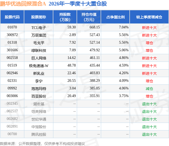 从基金规模来看,鹏华优选回报混合A基金2026年一季度公布的基金规模为0.45亿元,较上一期规模3617.66万元变化了834.22万元,环比变化了23.06%。该基金最新一期资产配置为:股票占净值比90.68%,无债券类资产,现金占净值比10.8%。从基金持仓来看,该基金当季前十大股票仓位达48.83%,第一大重仓股为TCL电子(01070),持仓占比为7.04%。