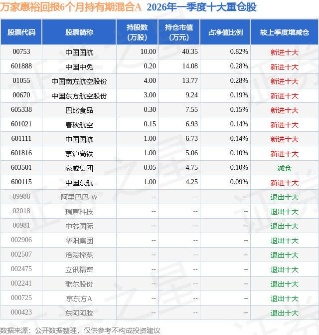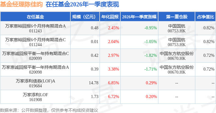 从基金规模来看,万家惠裕回报6个月持有期混合A基金2026年一季度公布的基金规模为0.48亿元,较上一期规模5048.42万元变化了-223.58万元,环比变化了-4.43%。该基金最新一期资产配置为:股票占净值比2.59%,债券占净值比70.85%,现金占净值比2.61%。从基金持仓来看,该基金当季前十大股票仓位达2.29%,第一大重仓股为中国国航(00753),持仓占比为0.82%。