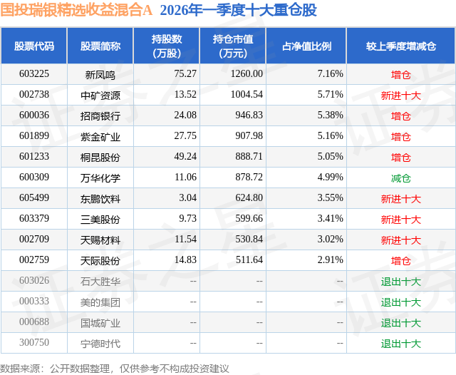 从基金规模来看,国投瑞银精选收益混合A基金2026年一季度公布的基金规模为1.76亿元,较上一期规模2.01亿元变化了-2526.98万元,环比变化了-12.57%。该基金最新一期资产配置为:股票占净值比73.19%,无债券类资产,现金占净值比9.11%。从基金持仓来看,该基金当季前十大股票仓位达46.34%,第一大重仓股为新凤鸣(603225),持仓占比为7.16%。