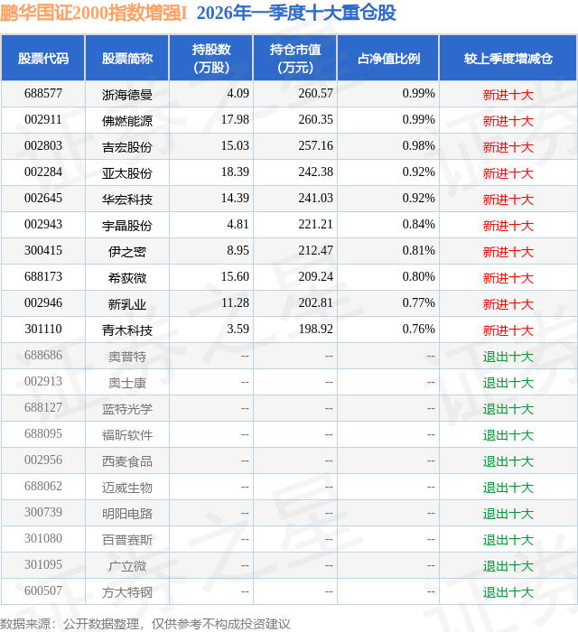 证券之星消息,日前鹏华国证2000指数增强I基金公布一季报,2026年一季度最新规模0.0亿元,季度净值涨幅为2.89%。