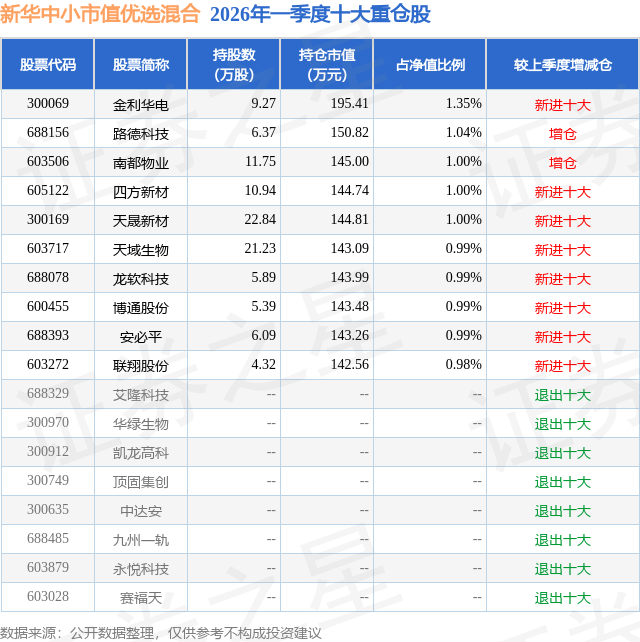从基金规模来看,新华中小市值优选混合基金2026年一季度公布的基金规模为1.45亿元,较上一期规模4570.19万元变化了9921.38万元,环比变化了217.09%。该基金最新一期资产配置为:股票占净值比85.74%,债券占净值比0.42%,现金占净值比6.77%。从基金持仓来看,该基金当季前十大股票仓位达10.33%,第一大重仓股为金利华电(300069),持仓占比为1.35%。