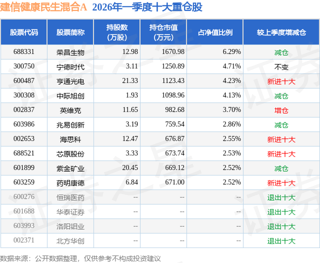从基金规模来看,建信健康民生混合A基金2026年一季度公布的基金规模为2.62亿元,较上一期规模4.08亿元变化了-1.46亿元,环比变化了-35.76%。该基金最新一期资产配置为:股票占净值比77.19%,无债券类资产,现金占净值比23.19%。从基金持仓来看,该基金当季前十大股票仓位达36.04%,第一大重仓股为荣昌生物(688331),持仓占比为6.29%。