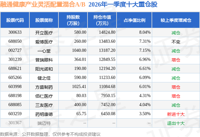 从基金规模来看,融通健康产业灵活配置混合A/B基金2026年一季度公布的基金规模为14.07亿元,较上一期规模23.18亿元变化了-9.11亿元,环比变化了-39.29%。该基金最新一期资产配置为:股票占净值比93.98%,无债券类资产,现金占净值比6.26%。从基金持仓来看,该基金当季前十大股票仓位达60.02%,第一大重仓股为开立医疗(300633),持仓占比为8.04%。