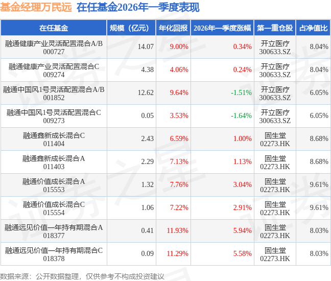 证券之星消息,日前融通健康产业灵活配置混合A/B基金公布一季报,2026年一季度最新规模14.07亿元,季度净值涨幅为0.34%。