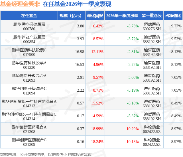 证券之星消息,日前鹏华创新医药混合C基金公布一季报,2026年一季度最新规模0.16亿元,季度净值涨幅为10.13%。