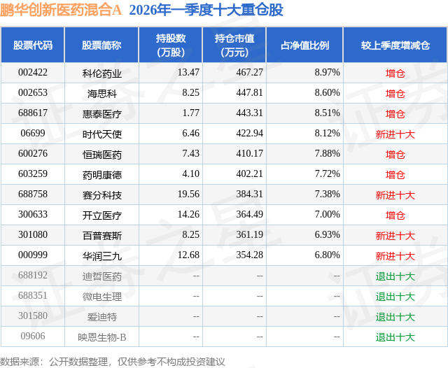 证券之星消息,日前鹏华创新医药混合A基金公布一季报,2026年一季度最新规模0.37亿元,季度净值涨幅为10.29%。