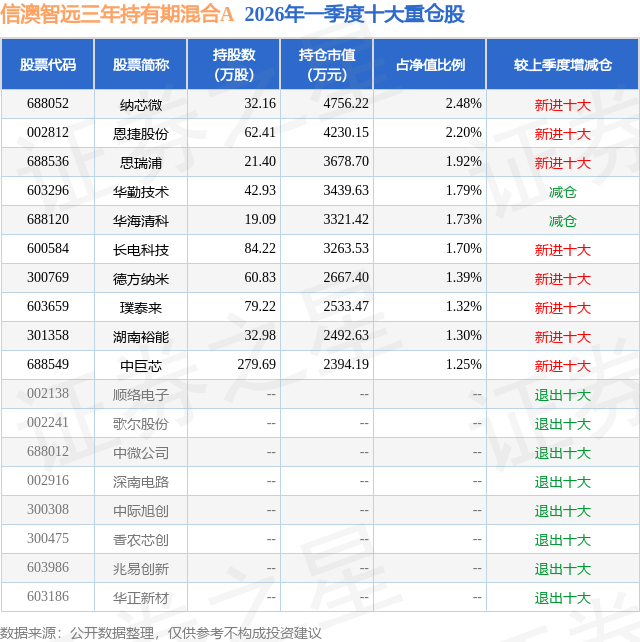 从基金规模来看,信澳智远三年持有期混合A基金2026年一季度公布的基金规模为16.44亿元,较上一期规模32.45亿元变化了-16.01亿元,环比变化了-49.34%。该基金最新一期资产配置为:股票占净值比94.19%,无债券类资产,现金占净值比6.39%。从基金持仓来看,该基金当季前十大股票仓位达17.08%,第一大重仓股为纳芯微(688052),持仓占比为2.48%。