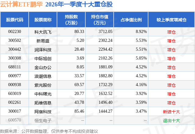从基金规模来看,云计算ETF鹏华基金2026年一季度公布的基金规模为4.16亿元,较上一期规模2.83亿元变化了1.33亿元,环比变化了46.94%。该基金最新一期资产配置为:股票占净值比98.81%,无债券类资产,现金占净值比1.26%。从基金持仓来看,该基金当季前十大股票仓位达49.19%,第一大重仓股为科大讯飞(002230),持仓占比为8.92%。