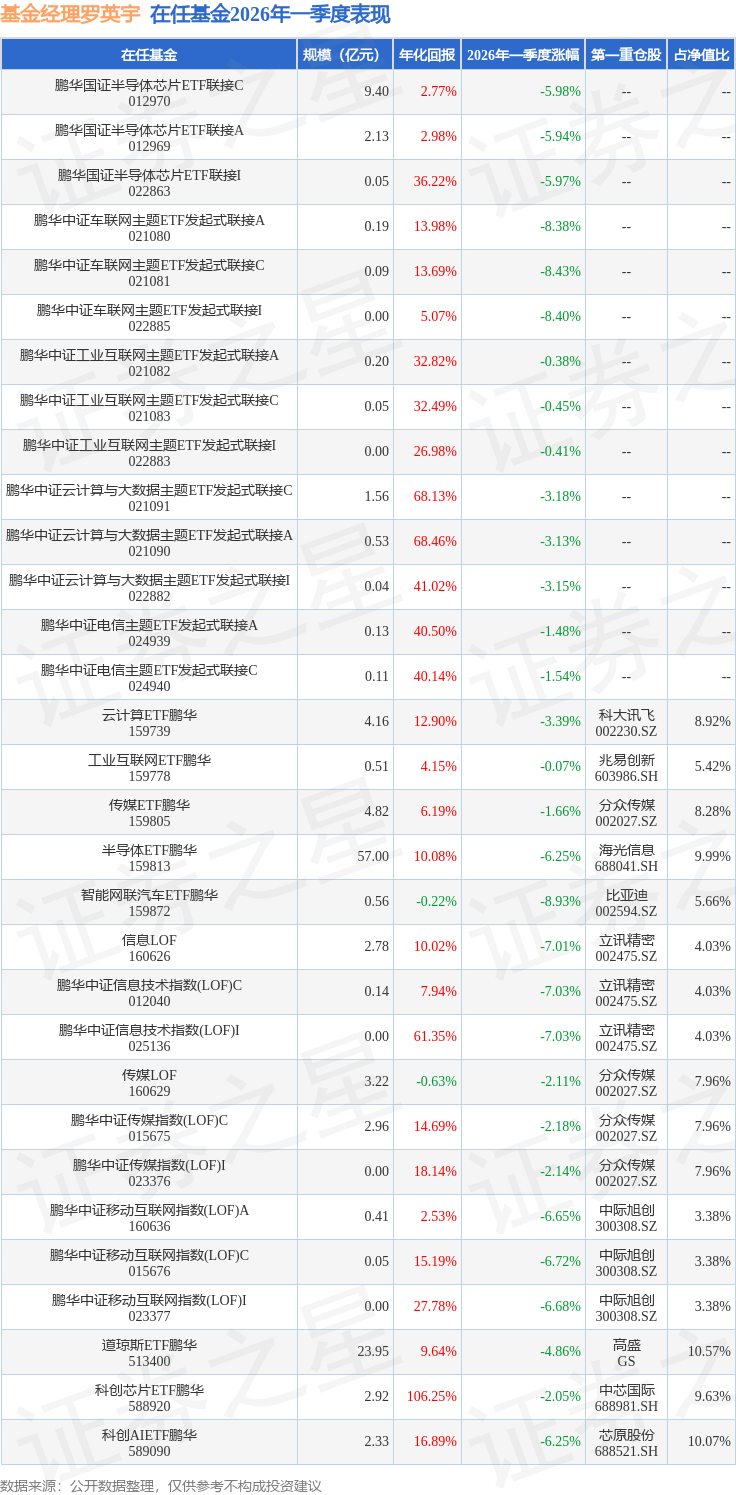 证券之星消息,日前云计算ETF鹏华基金公布一季报,2026年一季度最新规模4.16亿元,季度净值涨幅为-3.39%。