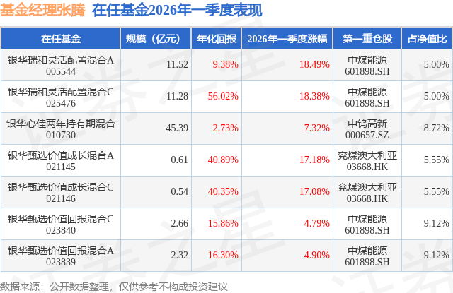 从基金规模来看,银华甄选价值成长混合C基金2026年一季度公布的基金规模为0.54亿元,较上一期规模1619.0万元变化了3822.06万元,环比变化了236.08%。该基金最新一期资产配置为:股票占净值比91.86%,债券占净值比0.09%,现金占净值比8.18%。从基金持仓来看,该基金当季前十大股票仓位达45.23%,第一大重仓股为兖煤澳大利亚(03668),持仓占比为5.55%。