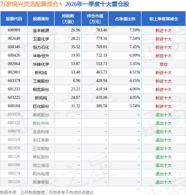 从基金规模来看,万家瑞兴灵活配置混合A基金2026年一季度公布的基金规模为0.84亿元,较上一期规模9226.59万元变化了-861.58万元,环比变化了-9.34%。该基金最新一期资产配置为:股票占净值比84.72%,债券占净值比6.2%,现金占净值比7.89%。从基金持仓来看,该基金当季前十大股票仓位达55.43%,第一大重仓股为宝丰能源(600989),持仓占比为7.59%。