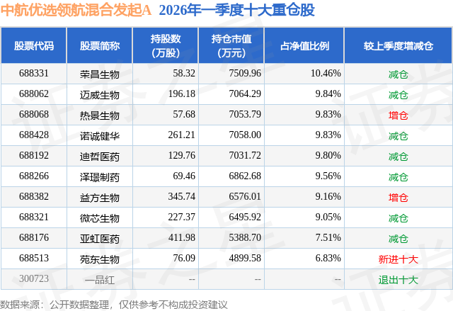 从基金规模来看,中航优选领航混合发起A基金2026年一季度公布的基金规模为0.54亿元。该基金最新一期资产配置为:股票占净值比92.33%,无债券类资产,现金占净值比6.67%。从基金持仓来看,该基金当季前十大股票仓位达91.87%,第一大重仓股为荣昌生物(688331),持仓占比为10.46%。