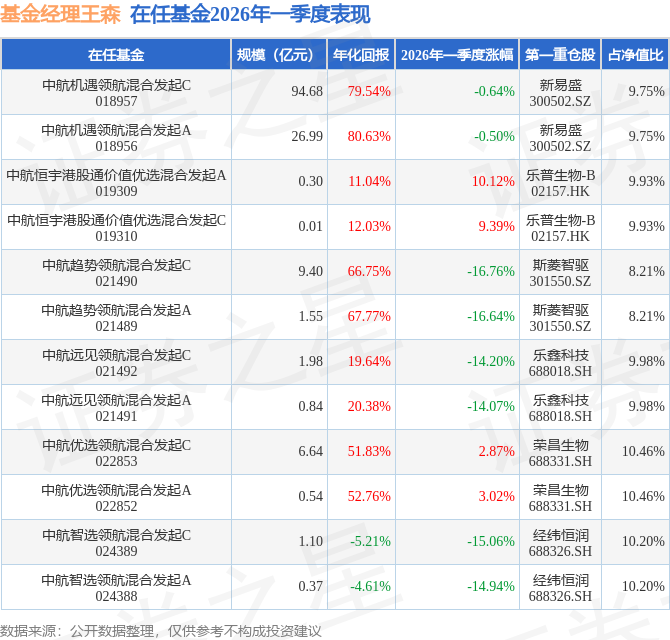证券之星消息,日前中航优选领航混合发起A基金公布一季报,2026年一季度最新规模0.54亿元,季度净值涨幅为3.02%。