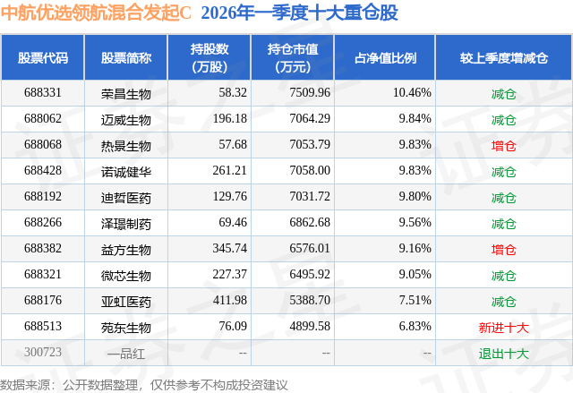 从基金规模来看,中航优选领航混合发起C基金2026年一季度公布的基金规模为6.64亿元。该基金最新一期资产配置为:股票占净值比92.33%,无债券类资产,现金占净值比6.67%。从基金持仓来看,该基金当季前十大股票仓位达91.87%,第一大重仓股为荣昌生物(688331),持仓占比为10.46%。