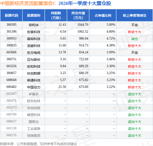 从基金规模来看,中银新经济灵活配置混合C基金2026年一季度公布的基金规模为0.01亿元,较上一期规模2246.06万元变化了-2117.28万元,环比变化了-94.27%。该基金最新一期资产配置为:股票占净值比93.58%,债券占净值比5.62%,现金占净值比3.68%。从基金持仓来看,该基金当季前十大股票仓位达39.35%,第一大重仓股为菲利华(300395),持仓占比为5.0%。