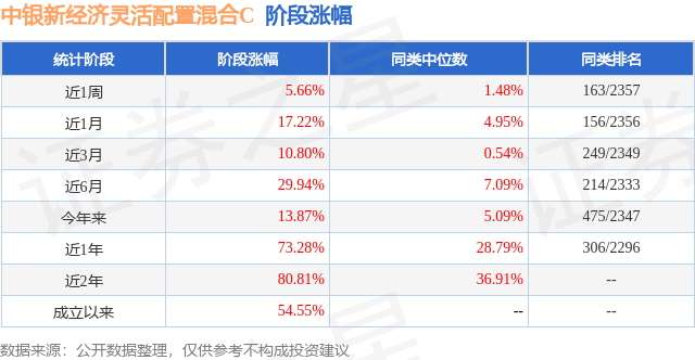从业绩表现来看,中银新经济灵活配置混合C基金过去一年净值涨幅为73.28%,在同类基金中排名306/2296,同类基金过去一年净值涨幅中位数为28.79%。而基金过去一年的最大回撤为-13.34%,成立以来的最大回撤为-26.39%。
