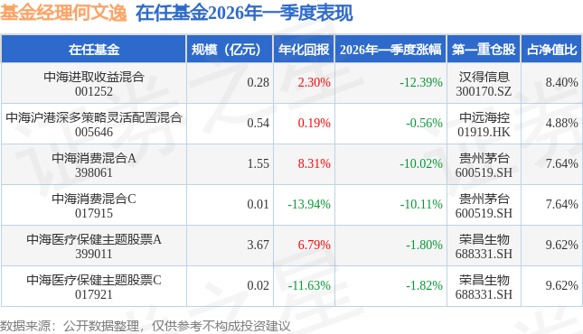 证券之星消息,日前中海医疗保健主题股票C基金公布一季报,2026年一季度最新规模0.02亿元,季度净值涨幅为-1.82%。