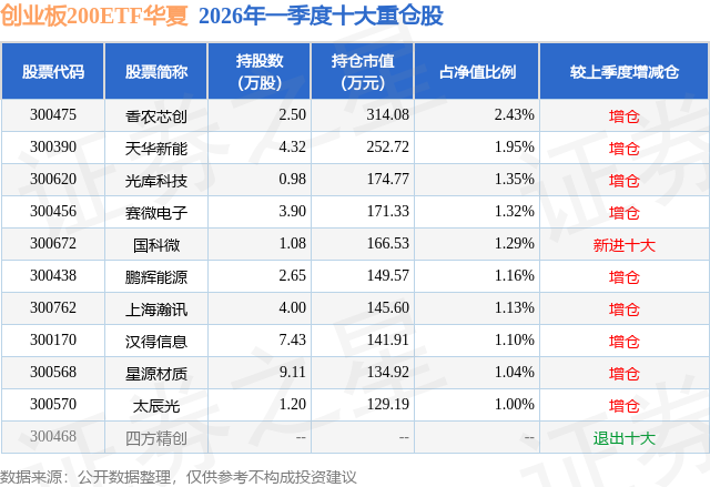证券之星消息,日前创业板200ETF华夏基金公布一季报,2026年一季度最新规模1.29亿元,季度净值涨幅为-3.94%。