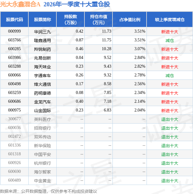 证券之星消息,日前光大永鑫混合A基金公布一季报,2026年一季度最新规模0.02亿元,季度净值涨幅为-0.26%。