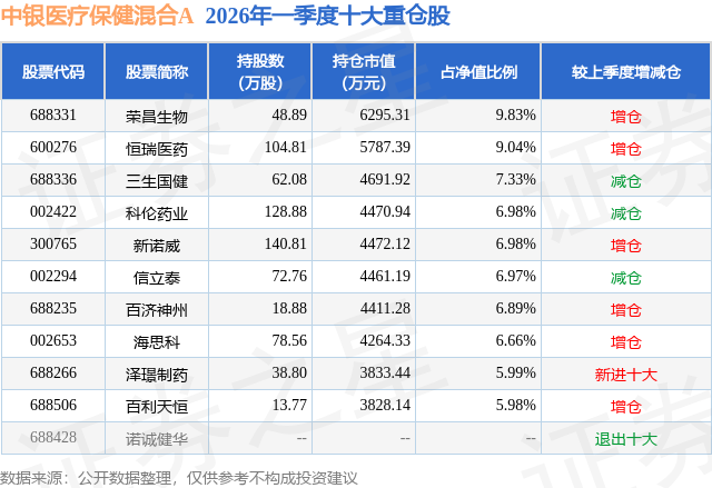 从基金规模来看,中银医疗保健混合A基金2026年一季度公布的基金规模为4.6亿元,较上一期规模8.78亿元变化了-4.18亿元,环比变化了-47.64%。该基金最新一期资产配置为:股票占净值比92.96%,债券占净值比5.32%,现金占净值比0.71%。从基金持仓来看,该基金当季前十大股票仓位达72.65%,第一大重仓股为荣昌生物(688331),持仓占比为9.83%。