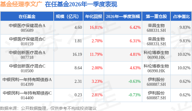 中银医疗保健混合A现任基金经理为李文广,本季度增聘基金经理李文广,近期离任的基金经理为郑宁。其中在任基金经理李文广已从业0年又129天,2026年3月6日正式接手管理中银医疗保健混合A,任职期间累计回报为16.94%。目前还管理着6只基金产品(包括A类和C类),其中本季度表现最佳的基金为中银医疗保健混合A(005689),季度净值涨幅为6.42%。