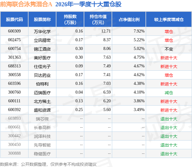 证券之星消息,日前前海联合泳隽混合A基金公布一季报,2026年一季度最新规模0.01亿元,季度净值涨幅为-2.05%。