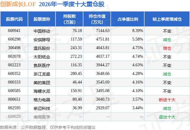从基金规模来看,创新成长LOF基金2026年一季度公布的基金规模为8.52亿元,较上一期规模9.5亿元变化了-9871.86万元,环比变化了-10.39%。该基金最新一期资产配置为:股票占净值比84.47%,无债券类资产,现金占净值比15.66%。从基金持仓来看,该基金当季前十大股票仓位达47.64%,第一大重仓股为中国移动(600941),持仓占比为8.39%。